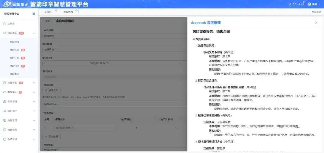 软件接入高阶AI:云玺量子智能印章智慧管理平台深度融合DeepSeek高阶AI,提供合同审批智能修正建议。
