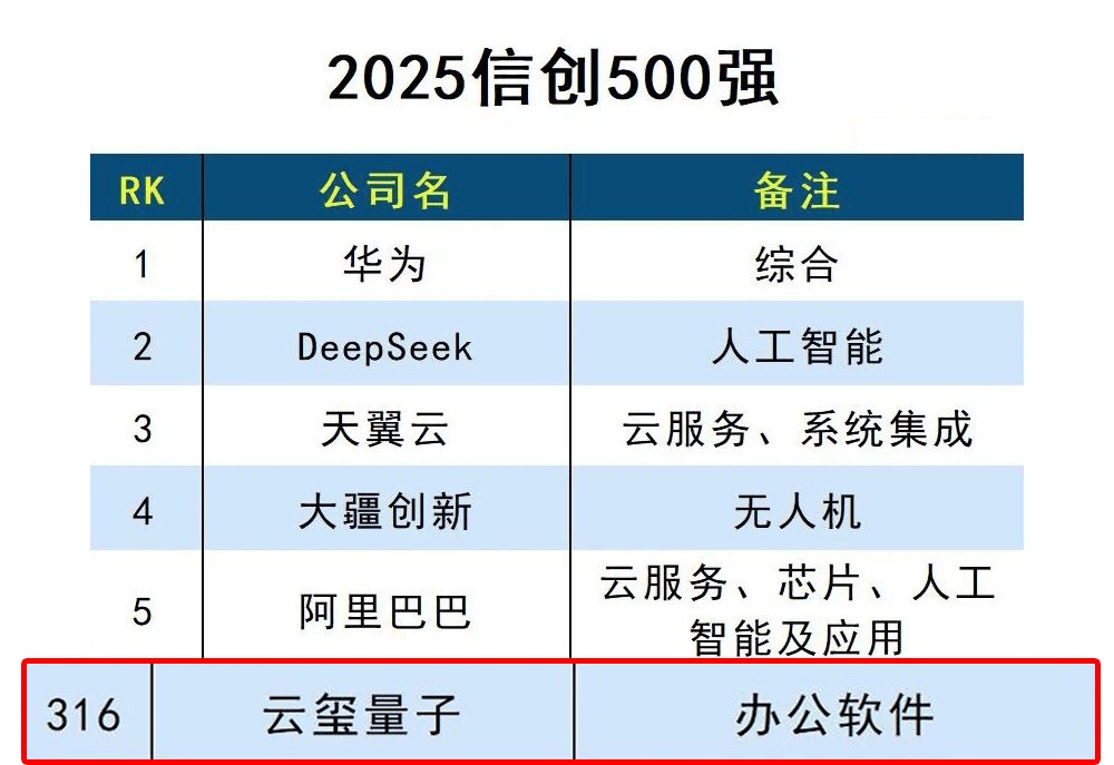 在由中国科学院主管的《互联网周刊》旗下权威机构德本咨询(DBC)正式发布的“2025中国信创TOP500榜单”中,云玺量子凭借其在量子安全办公领域持续的核心技术突破与行业深耕,连续六年登榜,并实现跨越式进阶——较2024年排名跃升超100位,跻身榜单第316名,成为信创产业培育“新质生产力”浪潮中的标杆企业。
