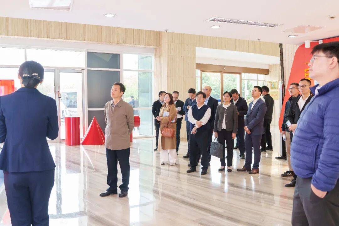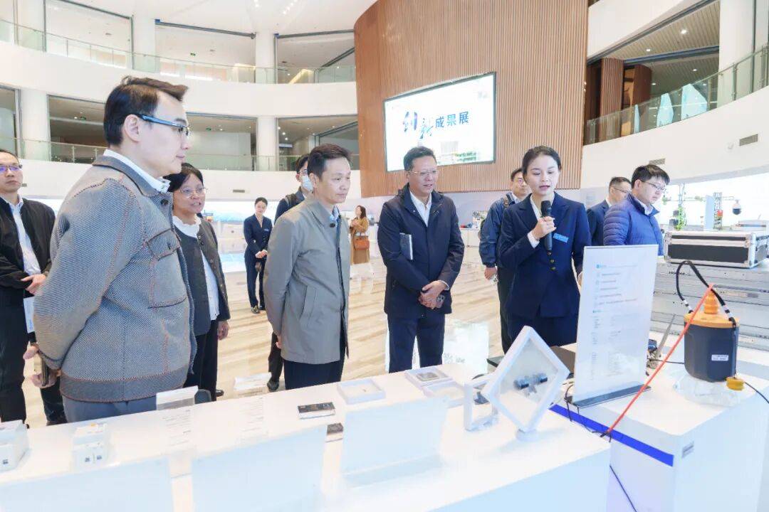 座谈结束后,参访团在董事长童迎伟与执行总裁鲁垚陪同下,前往中国科大先研院 B0 科技创新成果展厅参观,这里汇聚了众多前沿科技成果,讲解员围绕各类成果的技术原理、应用场景等进行了详细讲解。