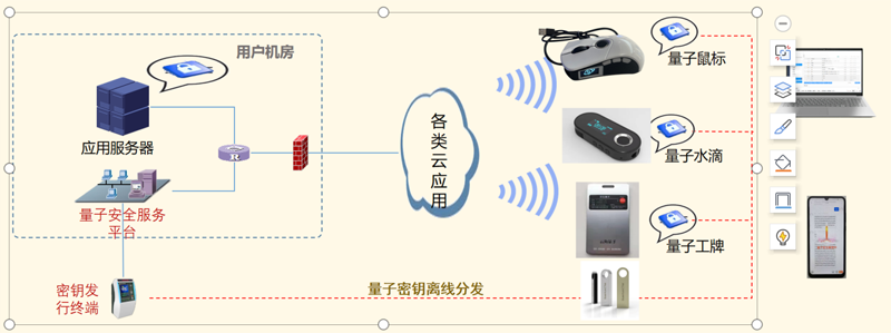 通过量子安全云服务和标准化终端插件,可以对现有通用云业务系统进行量子安全轻量化升级,实现云、端之间的量子安全通讯和数据保护。包括量子安全云服务和量子安全智能鼠标、智能工牌、智能水滴、UKEY等标准化终端插件。